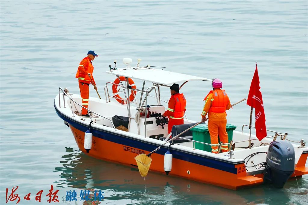 “海口冬季是旅游旺季,大批游客都会到海口湾、云洞、万绿园一带游玩,这片水域环境变得尤为重要。因此,虽然天气寒冷,但整个班组都加班加点,基本每天都在船上进行不间断的打捞作业,甚至夜间也会加班保障。”福龙马海口公司海上环卫班组班长谭忠平表示,今年的冬季比往年更为寒冷,海面风浪特别大,船摇晃严重,打捞作业难度增加,作业过程中手经常会被海水、雨水打湿,工作一小时双手就会被冻僵。