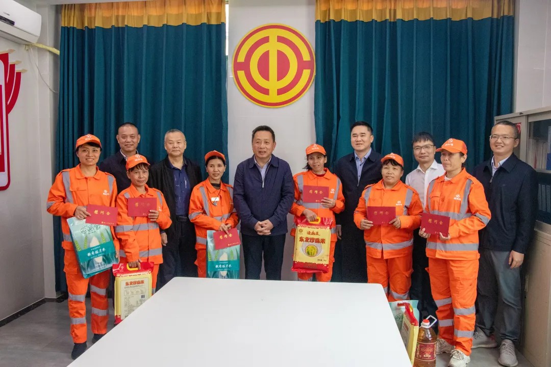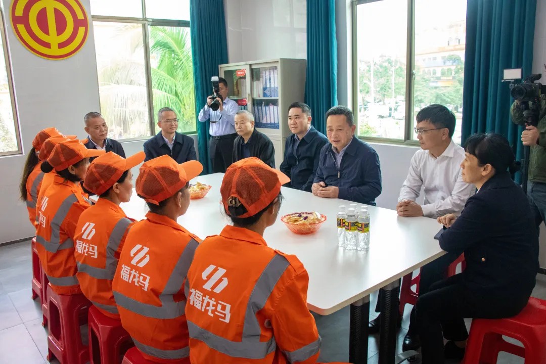 元旦将至,为解决一线环卫职工的实际困难,让她们度过一个愉快祥和的新年,12月31日下午,海口市总工会主席冯明、市总工会常务副主席刘川海、市总工会党组成员、副主席蒋祖华、市总工会权益保障部部长郭菊丹、龙华区总工会主席李美健,龙华区总工会常务主席陈文琼等领导,来到福龙马金牛路三位一体工作站,慰问公司困难环卫工人甘海霞 、吴芳、张彩玉、梁秀琼 、吴连霞、王玉选等职工,并分别为她们送上慰问金和慰问品。福龙马海口公司总经理黄彪、工会主席陈伟参加慰问活动。