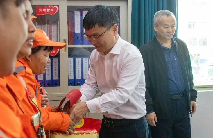 龙华区总工会主席李美健为环卫工人发放慰问品