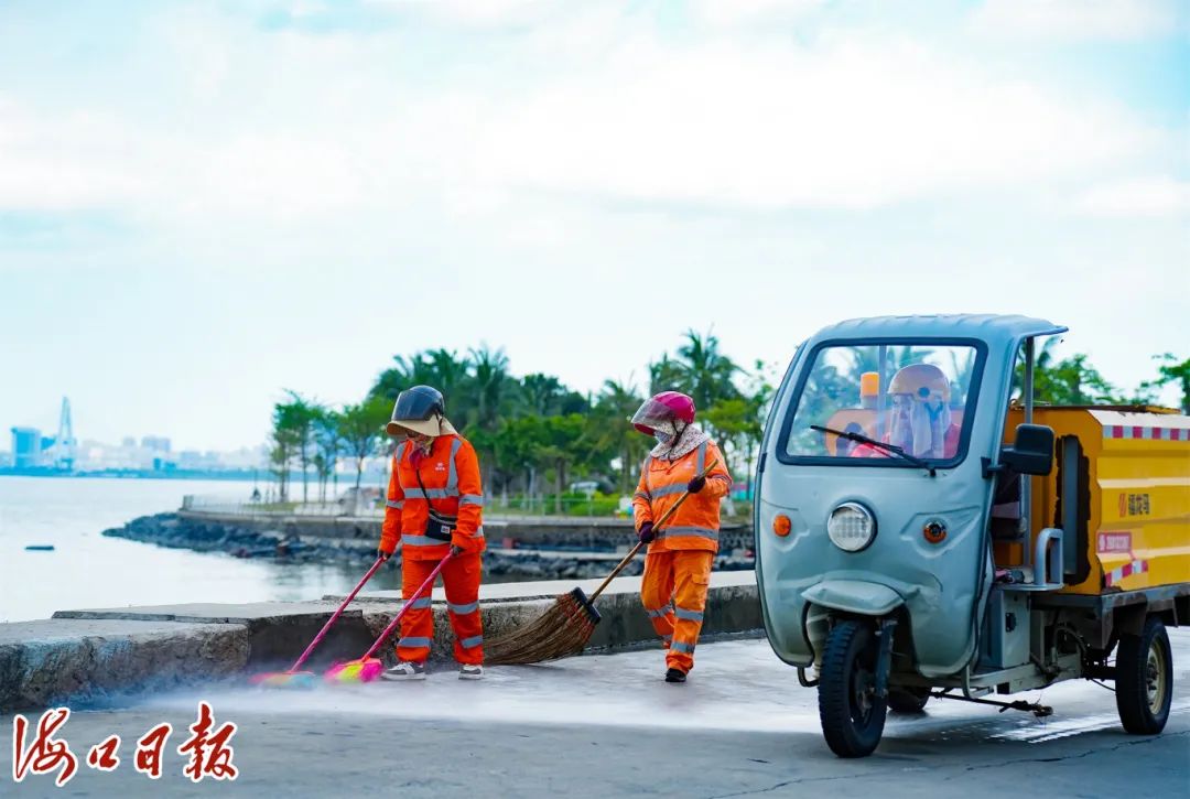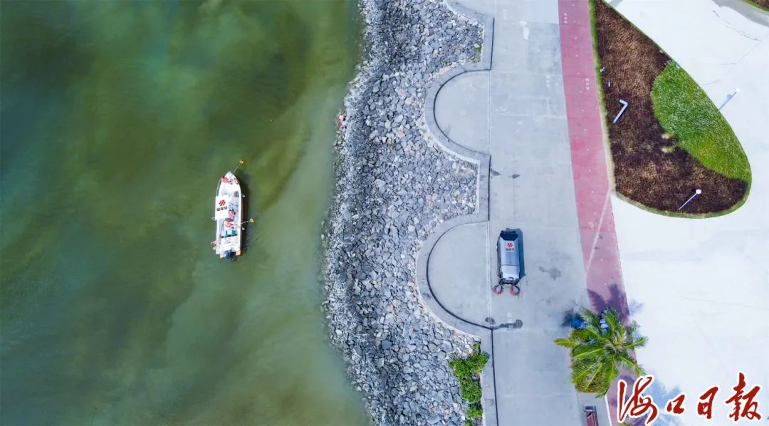 在风景如画的世纪公园内,福龙马海口公司的环卫工人吴春梅早早便驾驶着保洁车,开始了新一天的保洁作业。与此同时,海面上游弋的打捞船与天空中盘旋的无人机,共同编织成一道坚不可摧的环卫屏障,守护着这片美丽的海域。