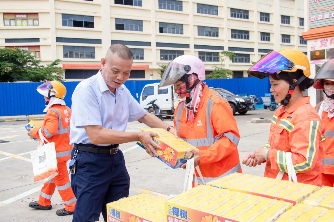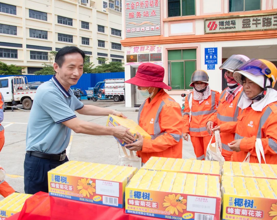 龙华区总工会副主席林胜雄为环卫工人发放降暑饮品