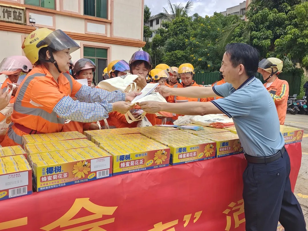 龙华区总工会副主席林胜雄向坚守一线环卫工人表示敬意:环卫工人风雨无阻、默默无闻地为城市的环境卫生保驾护航,通过慰问,在这个夏日给环卫工人们带来清凉,同时也送上一份感谢,没有你们就没有海口如此美丽的环境。并嘱咐环卫工人在高温天气下一定要注意劳逸结合,做好自身防护。