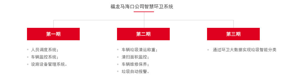 福龙马海口公司智慧环卫系统在环卫市场化的新形势下依托母公司高端的环卫装备和智慧环卫软件研发的优势孕育而生。目前这套系统是专门针对海口地区环卫环境市场最新定制的智能系统。系统总体涵盖五个板块,分三期完成。目前已经实现了第一期功能:人员调度系统,车辆监控系统,设施设备管理系统。随着二期的发展,将实现车辆垃圾清运称重,清扫面积监控,车辆维修保养,垃圾自动报警。三期将通过环卫大数据实现垃圾智能分类。